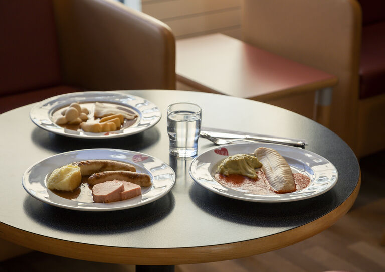 "Ziel ist es, Bewohner*innen mit wenig Appetit zum Essen zu motivieren. Dabei achten wir darauf, natürliche Zutaten zu verwenden und den Teller möglichst ansprechend und bunt zu gestalten, zum Beispiel braunes Fleisch, grünes Gemüse und eine gelbe Sättigungsbeilage", erklärt Michael Buchegger von der SANA Qualitätssicherung. Als Fleischkomponente eignen sich besonders gut Würstchen, Hühnerkeulen und Braten. Heute profitieren 55 Bewohner*innen im Pflegekrankenhaus Seeböckgasse von der Dysphagiekost. Unterstützt wird die tägliche Umsetzung durch einen umfassenden Rezeptkatalog mit rund 150 bewährten Gerichten. Alle Mühe zahlt sich aus, wie auch Bärbel und Cornelia finden: "Oft kommt ein leerer Teller zurück. Das ist ein absolutes Erfolgserlebnis!"