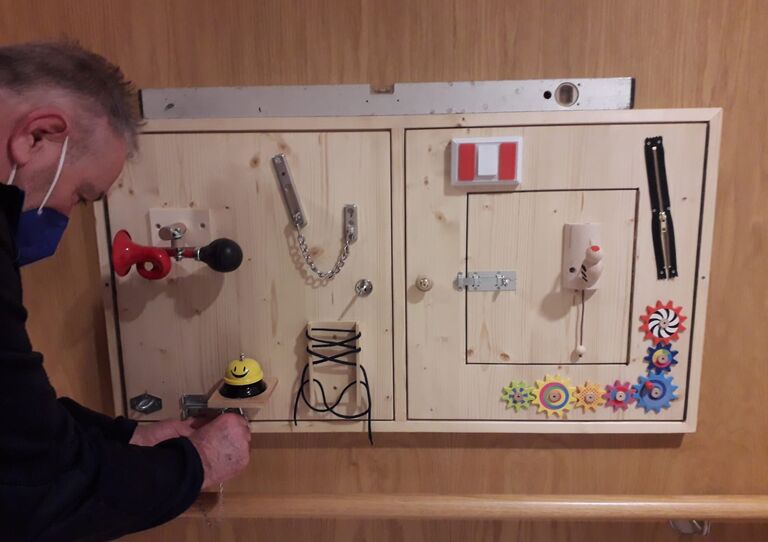 Erinnerungspflege ist ein wichtiger Teil der Pflege und Betreuung von Menschen mit Demenz. Erinnerungen können mit Freude erfüllen und durch Erinnerungen gelingt oft auch der Zugang zu Menschen, die an Demenz erkrankt sind. Im HB Stephansheim hilft nun eine sogenannte „Demenzwand“ – bestückt mit Alltagsgegenständen – dabei, über Wahrnehmungen wie Hören, Sehen oder Fühlen Erinnerungen unserer Bewohner*innen zurückbringen. Ermöglicht hat dies unser großartiger ehrenamtlicher Mitarbeiter Edi Poss, der gemeinsam mit seinem Freund Wilfried die Wand entworfen, gebaut und montiert hat.