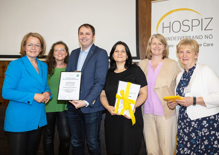 Poysdorf / Mistelbach, 5.5.2022 – Das Haus der Barmherzigkeit Urbanusheim in Poysdorf hat in den vergangenen Jahren die Rahmenbedingungen für eine gelebte Hospizkultur geschaffen. Als erstes privates, gemeinnütziges Pflegeheim im Weinviertel absolvierte das Urbanusheim das Programm „Hospizkultur und Palliative Care im Pflegeheim“ des Landeshospizverbands Niederösterreich. Im Rahmen des Fachtags „Palliative Geriatrie“ überreichten Landesrätin Mag. Christiane Teschl-Hofmeister und Landtagsabgeordnete Mag. Karin Scheele in Vertretung von Landesrätin Ulrike Königsberger-Ludwig am vergangenen Mittwoch in St. Pölten die Urkunde für die erfolgreiche Projektumsetzung an das Team des Pflegeheims in Poysdorf.